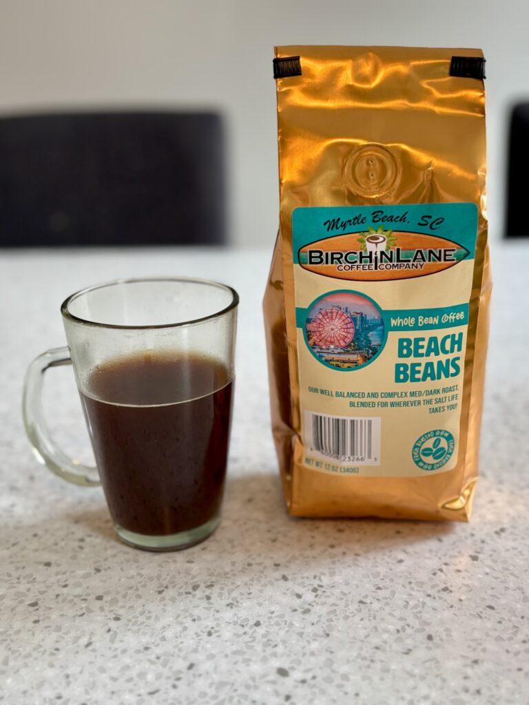 Birchin Lane opened in 2021, in North Myrtle Beach becoming popular essentially over night and growing rapidly, allowing them to open a second location in 2024. With in-house roasted coffee by an extremely talented team, the drinks they offer are phenomenal. Check out my Birchin Lane Coffee Shop review to learn more about the shop itself. If you read my Tall, Dark and Handsome review you may recall how much I enjoyed that coffee, so let’s find out if Beach Beans can live up to this hype!