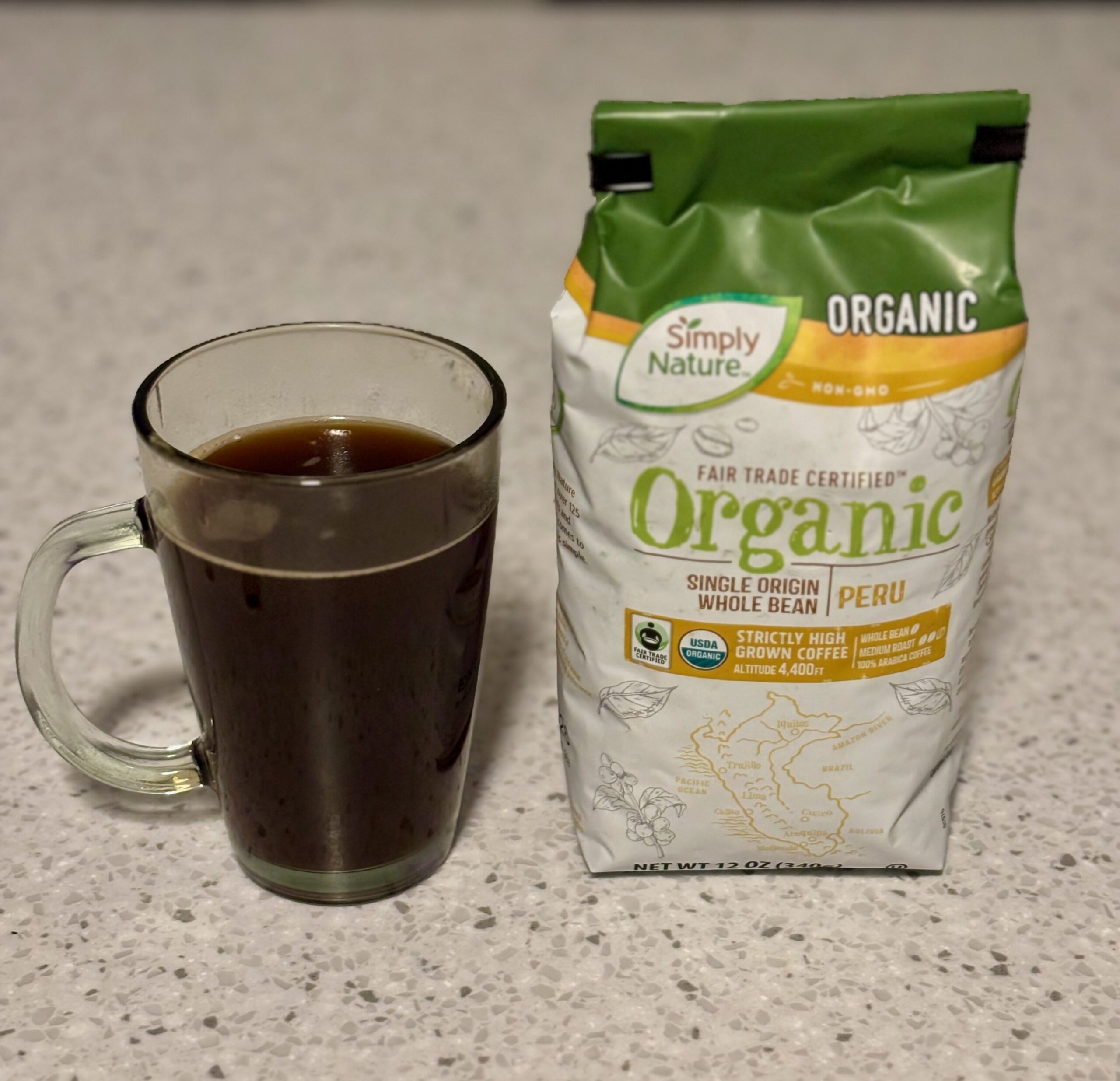 Similar to the Simply Nature Honduras (read my review here), this is another strictly high-grown coffee, which leads to higher quality beans with more flavor. At a price point of $5.79 for 12 ounces ($7.72 per pound), Simply Nature Organic Peru Single Origin coffee is another value offering. After being pleasantly surprised by the Simply Nature Honduras coffee I was looking forward to picking up a bag of the Peruvian beans next chance I got. Let’s see it compares!