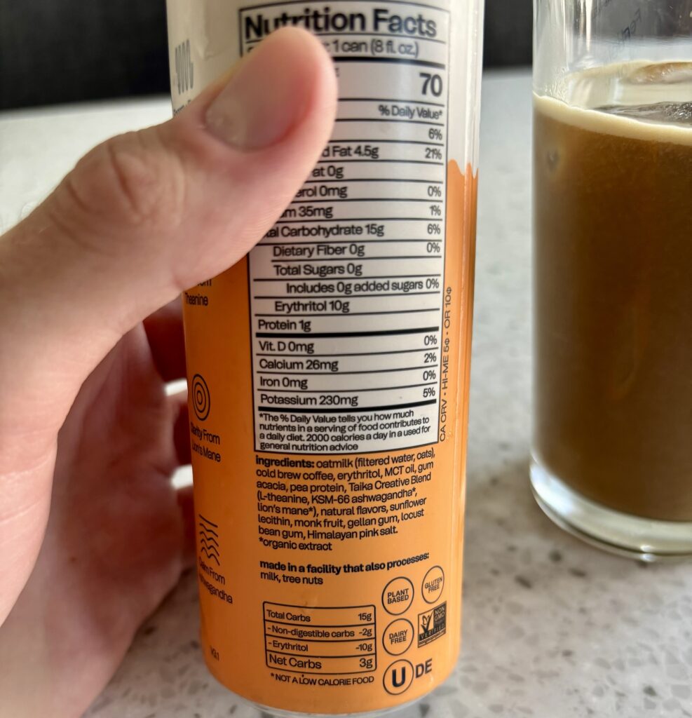 Before reviewing the coffee, I want to mention that, despite being marketed as a ‘healthier’ alternative to coffee, there are some ingredients in Taika’s drinks that, in my opinion, make a high-quality coffee like Purity or Java Planet a better choice. As you can see in the photo above, Taika includes natural flavors, erythritol, and guar and locust bean gum in their drinks. Sugar alcohols like erythritol and gums like guar and locust bean have been linked to unpleasant side effects such as gastrointestinal issues. While these ingredients are commonly used in flavored canned beverages, I like to call them out when found in ‘health-focused’ drinks, as I feel it can be slightly deceptive marketing.