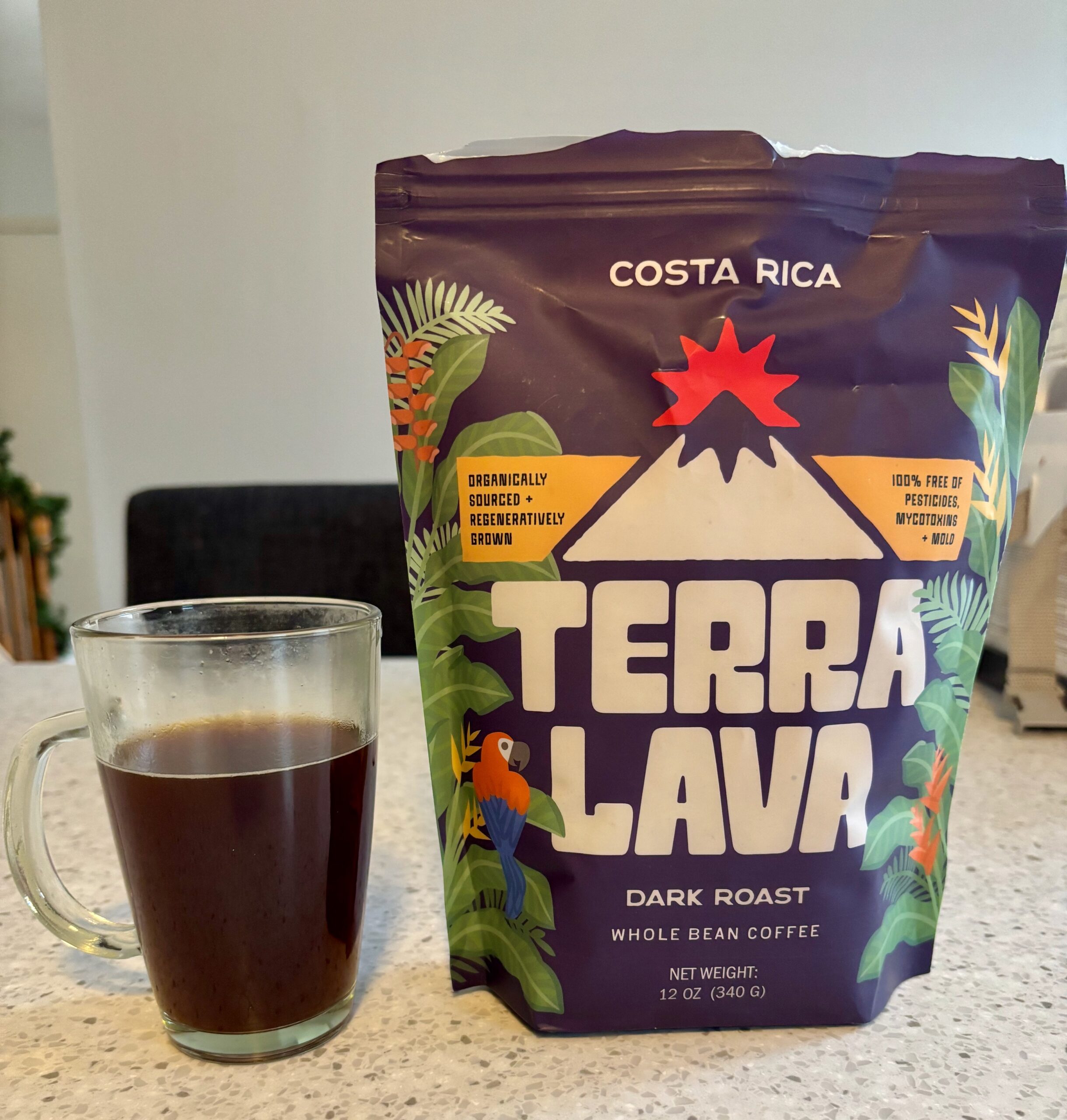 The company partnered with MK Supplements, another family-owned and sustainability-focused business, to create a high-quality, health-focused, small-batch coffee brand for their product lineup. Terra Lava was a perfect fit, as all of their coffee is third-party lab tested to ensure it is free of mold, mycotoxins, and pesticides. As you know, I love organic and third-party-tested coffee here at Coasters & Coffee, so you can see why I’m excited to share this brand with you all! While I love clean coffee, I also love great tasting coffee! So let’s find out if Terra Lava checks that box too.